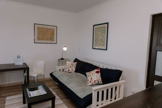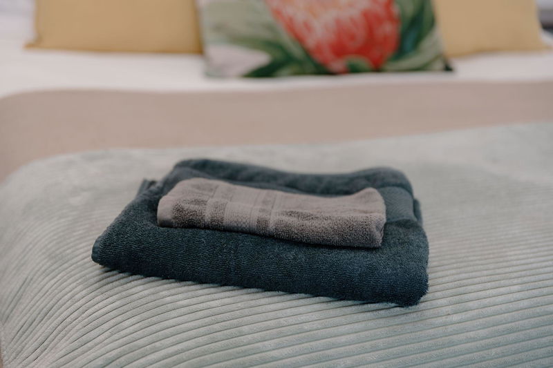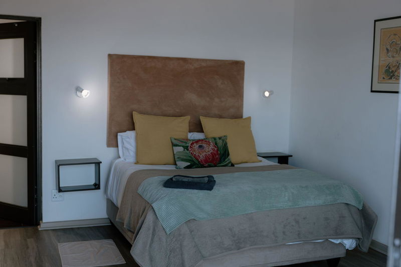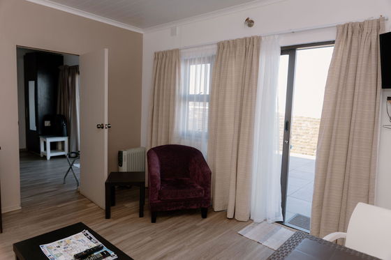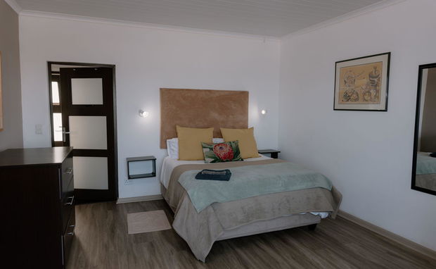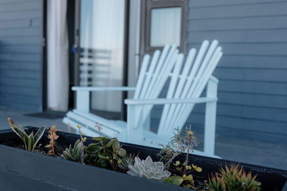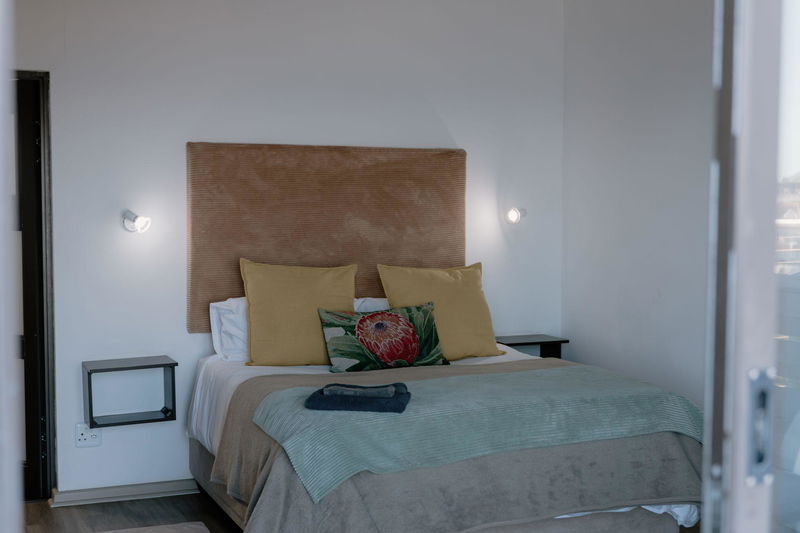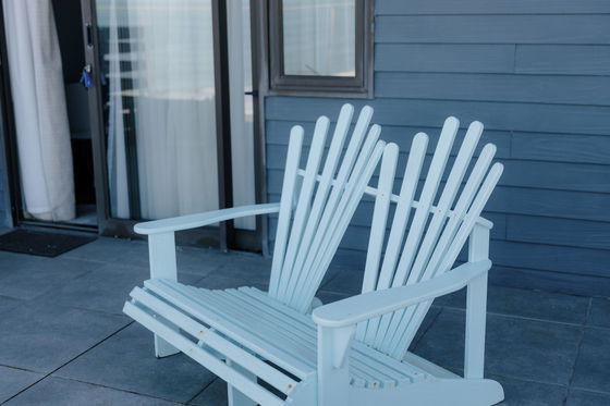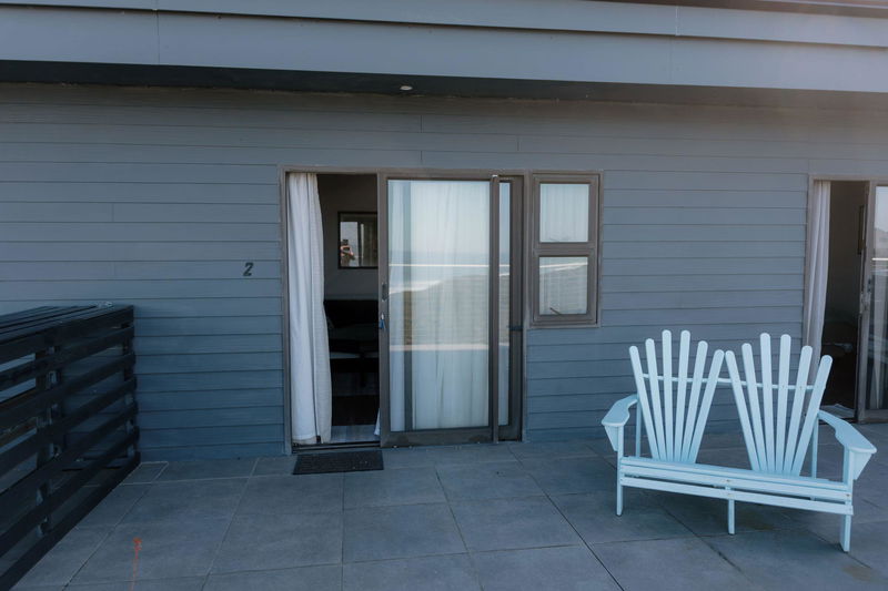 Spacious rooftop deck unit with a separate bedroom and lounge, both enjoying sea views. Outdoor deck with table and chairs.